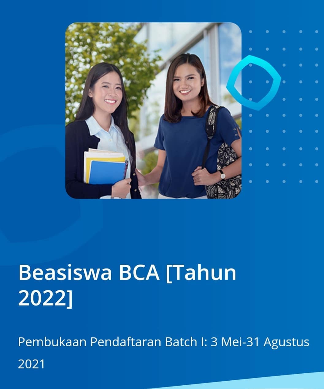 BCA kembali membuka beasiswa pendidikan yang terbagi menjadi dua program. Kedua program tersebut adalah Program Pendidikan Bisnis dan Perbankan (PPBP) dan Program Pendidikan Teknik Informatika (PPTI). Beasiswa ini dibuka untuk seluruh pemuda Indonesia lulusan SMA/SMK.