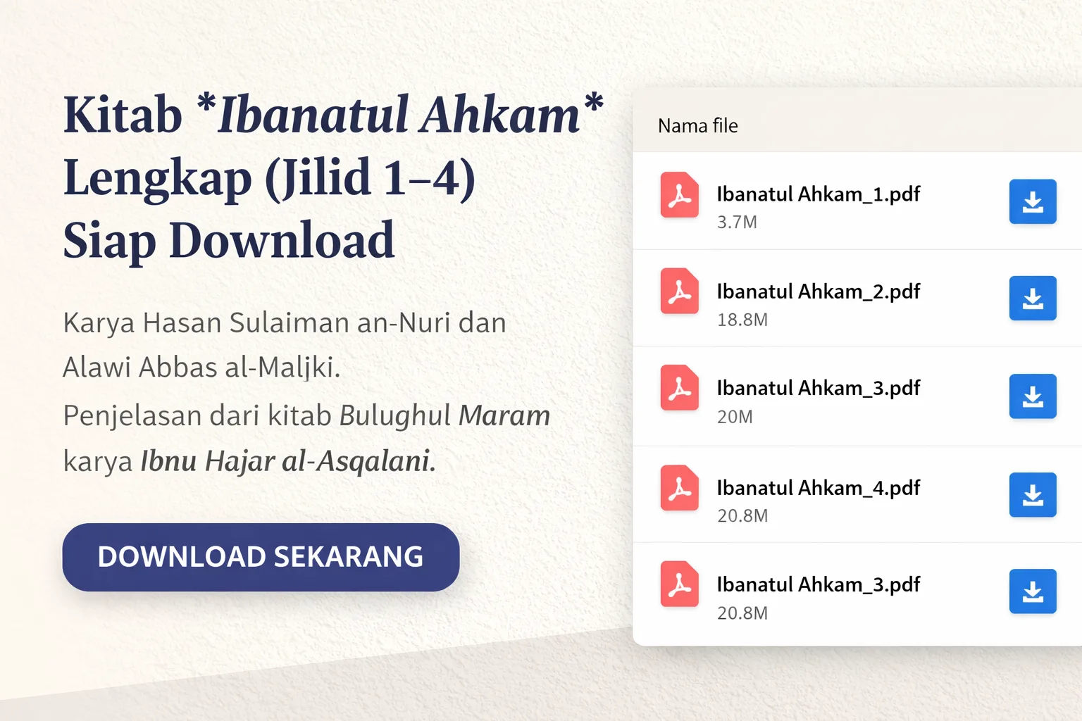 Bagi Anda yang ingin memperdalam pemahaman fiqih berbasis hadis secara sistematis, kini tersedia kitab Ibanatul Ahkam dalam versi lengkap jilid 1 hingga 4 yang siap untuk diunduh.