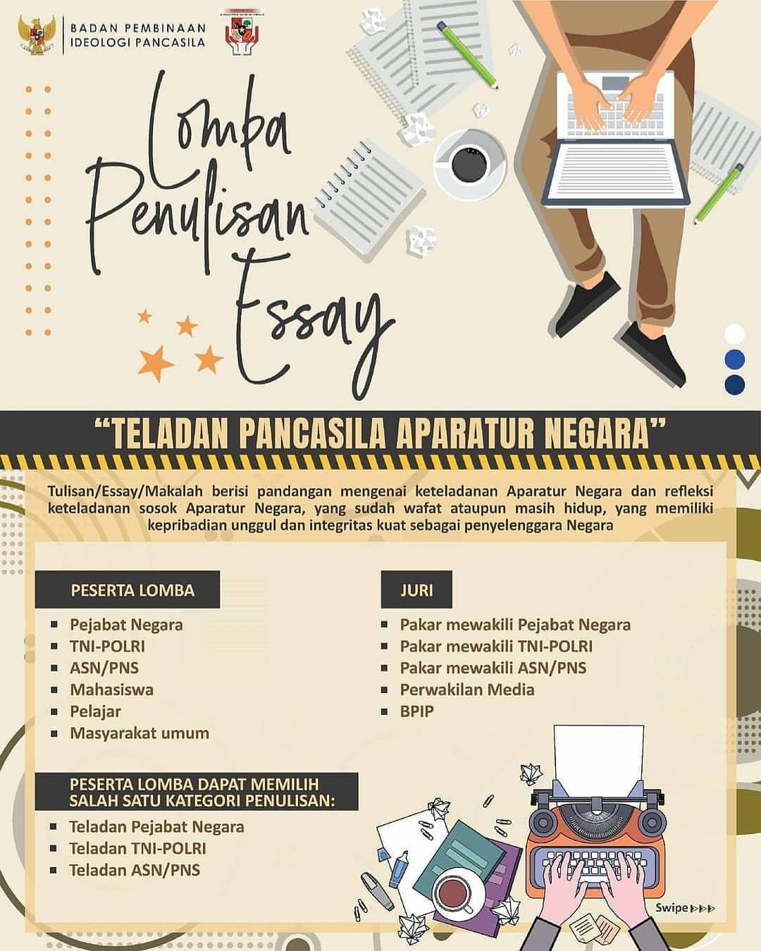 DALAM RANGKA HARI LAHIR PANCASILA 1 JUNI 2021, BPIP mengadakan Lomba Penulisan Esay dengan tema “TELADAN PANCASILA APARATUR NEGARA”.