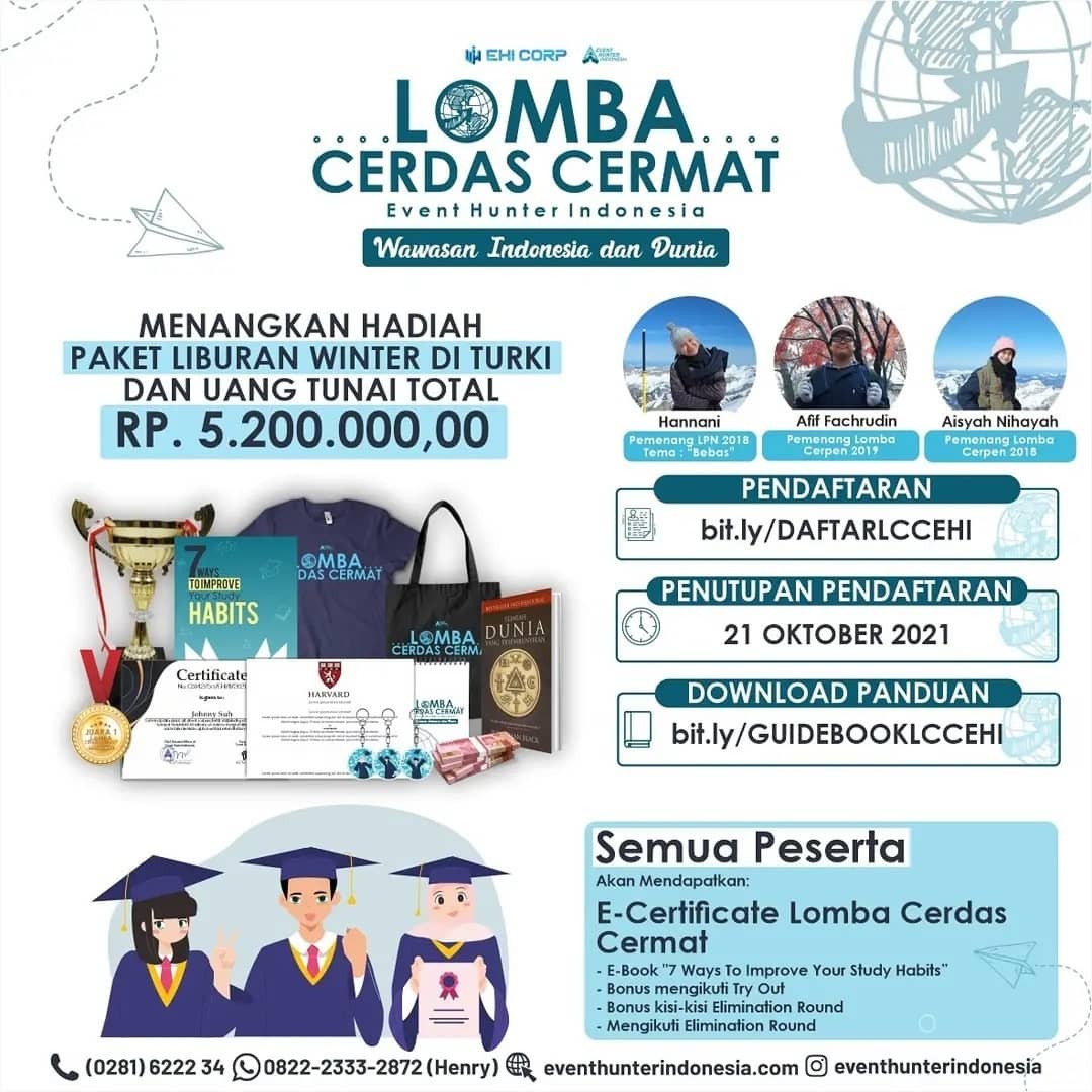 Tunjukan kemampuan wawasanmu tentang Indonesia dan Dunia kemudian menangkan Hadiah Utama Paket Liburan Winter Di Turki 10 Hari, Uang Tunai Jutaan Rupiah, Trophy, Medal, Certificate, Tote Bag Exclusive, Buku dan masih banyak hadiah lainnya melalui Lomba Cerdas Cermat 2021 by Event Hunter Indonesia.