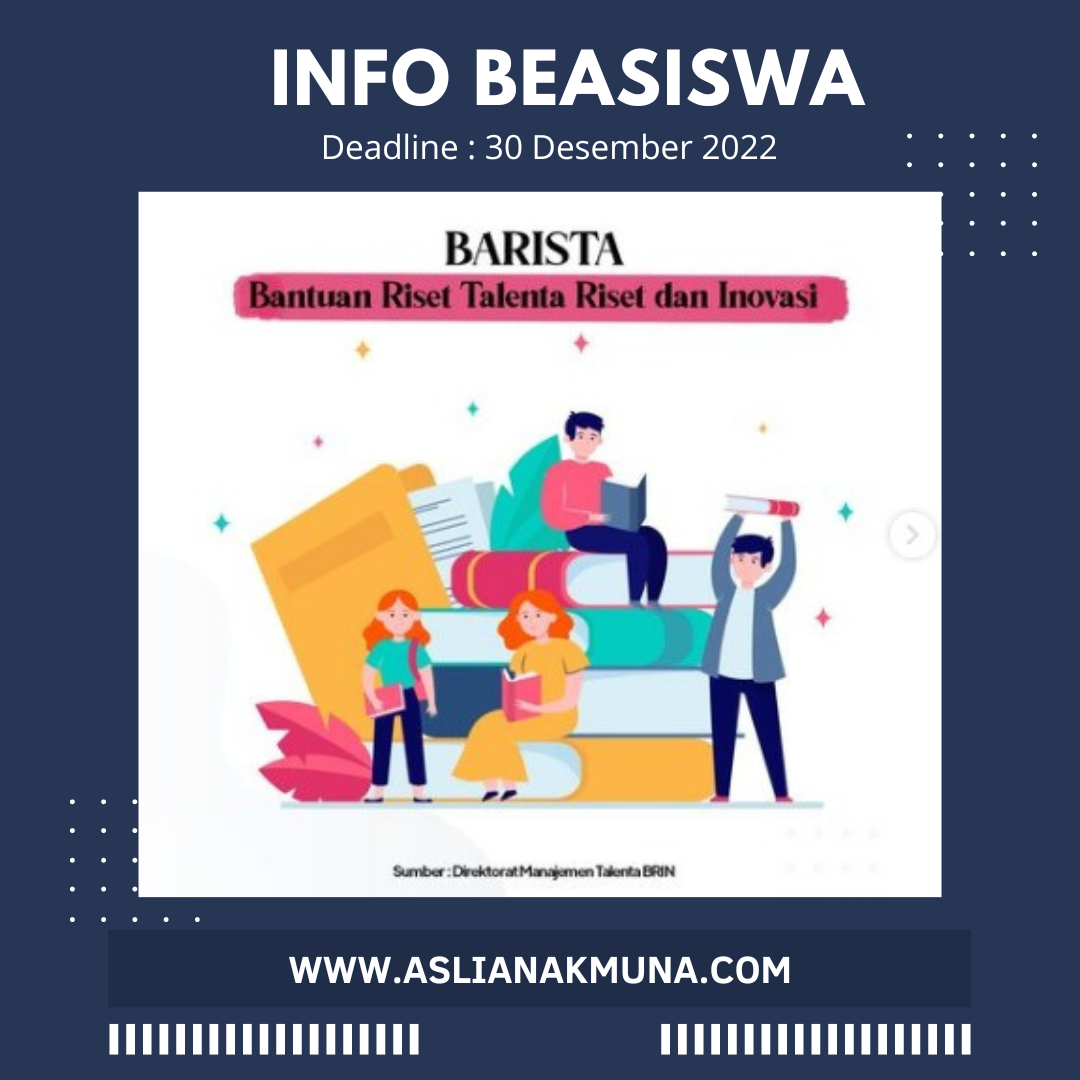 Beasiswa Bantuan Riset Talenta Riset dan Inovasi atau Barista merupakan program yang diselenggarakan oleh BRIN atau Badan Riset dan Inovasi Nasional. Beasiswa ini ditujukan untuk mahasiswa akhir di jenjang pendidikan D4, S1, S2, dan S3.
